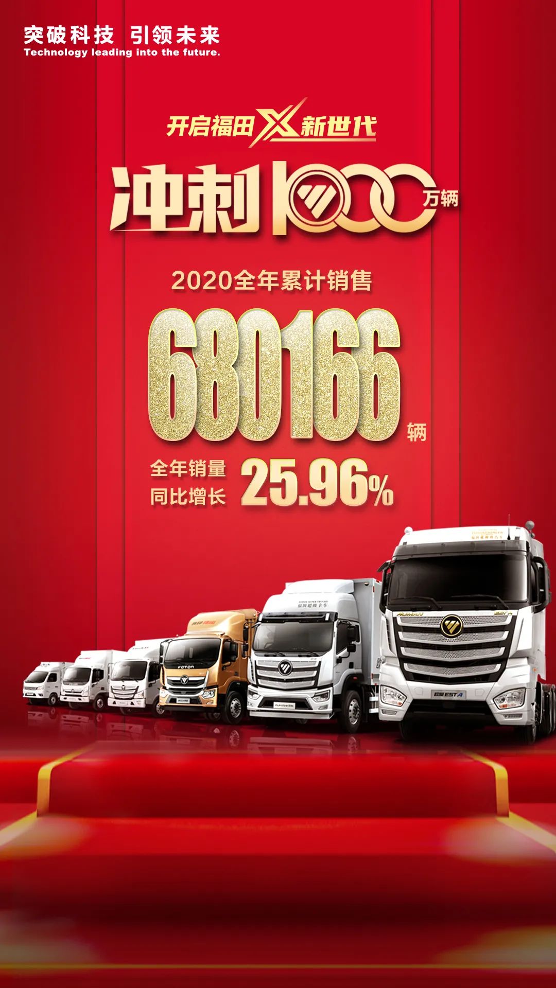 2018年起,尊龙凯时福田聚焦商用车主业,以“三年行动计划”为战略目标,聚焦价值、精益运营,不断加大商用车投入、锻造核心竞争力,实现经营业绩逆势增长,体现了销量、收入、利润全方面的高质量发展态势。2020年,尊龙凯时福田全年累计销售各类车型68.02万辆,实现26%的同比增长,以实力捍卫了其在国内商用车行业的市场地位。